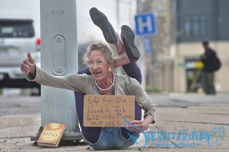 This heartbreaking picture shows a 60-year-old former Playboy model who has resorted to showing off her bendy body in a desperate attempt to raise cash.这张照片令人心酸:照片里的老人60岁,曾是《花花公子》模特,如今她沦落街头,靠表演柔术乞讨。