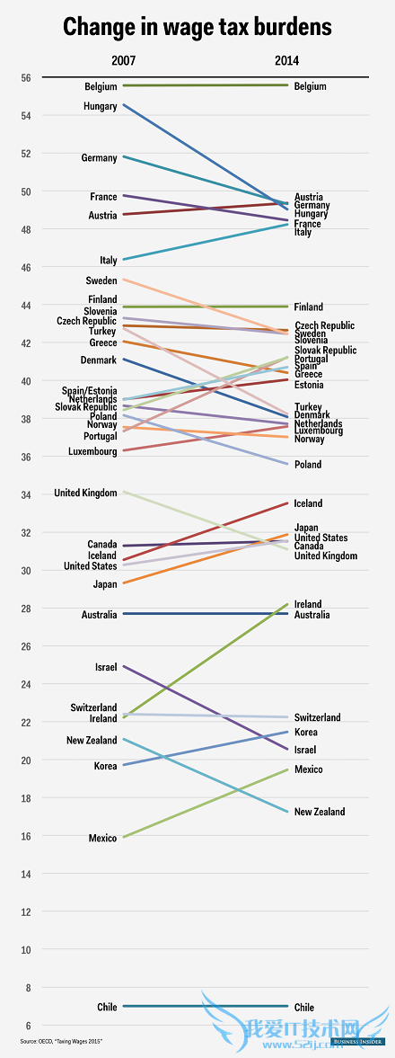 Here's how the tax wedge for an average full-time single worker has grown or shrunk in each OECD country between 2007 and 2014. The chart also shows how different countries' tax burdens as a percentage of income compare to each other.下图为OECD各国在2007-2014年期间,普通单身全职工人的税收楔子的变化情况。它还显示了各国之间,税负占收入比例的不同。