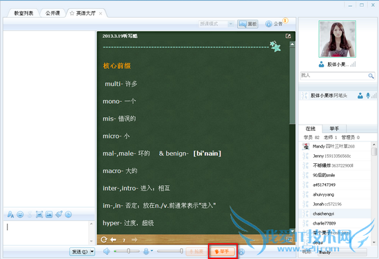 6. 讲座期间进入英语大厅后,如果想发言,请点击下图中的“举手”(橘色按钮),被主持人选中后就可以发言。说话的时候可以看到麦克进度条在随麦克声音发生变化,别人说话也可以看到耳机或扬声器的进度条在变化。