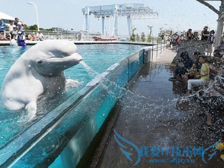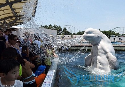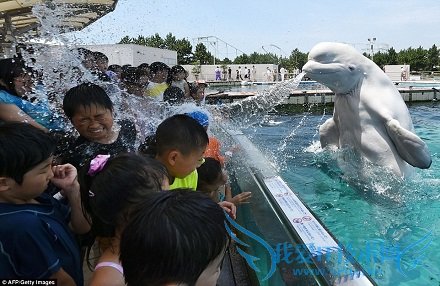 As temperatures hit 93.2F (34C) on the first day after rainy season in Japan this playful beluga whale rose out of the pool and sprayed them with water.日本雨季过后的第一天,当地气温达到了93.2华氏度(34摄氏度)。水池中有一头白鲸游了上来,还向人们洒水玩。