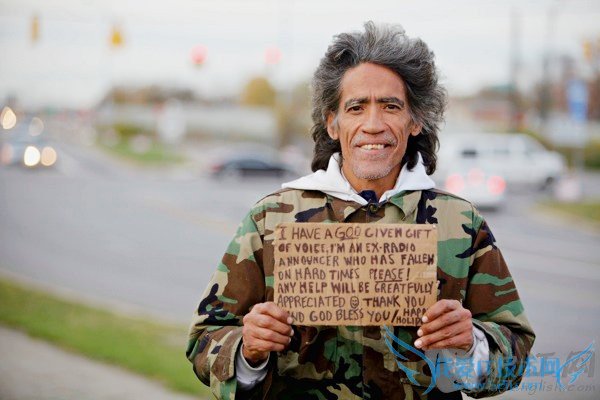 Sign: "I have a God given gift of voice. I'm an ex-radio announcer who has fallen on hard times. Please! Any help will be greatfully appreciately :) Thank you and God bless you. Happy Holidays."