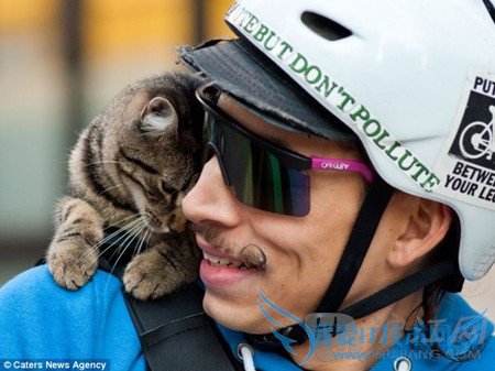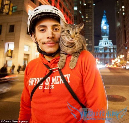 The 25-year-old bike courier and his six-month-old kitten deliver parcels all across their home town of Philadelphia and hope to manage 100 mile rides in less than a year.鲁迪今年25岁,每天骑着自行车穿越家乡费城的大街小巷送快递,6个月大的MJ就趴在主人的肩膀上,这对组合在过去不到一年的时间里,骑行距离已经达到了100英里。