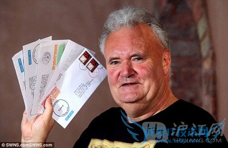 Angus McDonagh, 64, claims he has duped Royal Mail with over a hundred of his bizarre designs on letters which have been posted all over the world.现年64岁的安格斯·麦当诺声称,他常年来一直在英国皇家邮政面前蒙混过关,用自行设计的诡异邮票向世界各地寄出了百余封信。