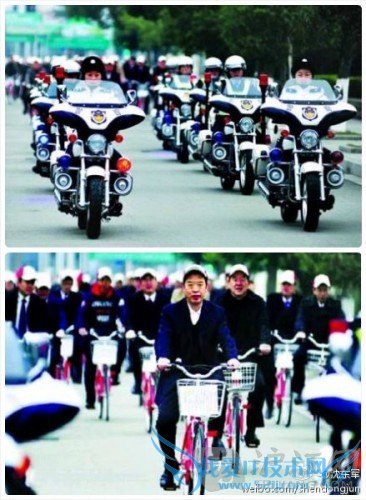 日前一张冠名为“温岭大小领导骑自行车体察民情,9辆警车鸣笛开道”的照片在微博等网络空间热传,警用摩托车在前开道,领导在后骑着单车,旁边还有记者在摄像。温岭市委宣传部负责人接受记者采访时称,当天是举办公共自行车的启动仪式,绝非领导作秀,只是为了交通畅通。