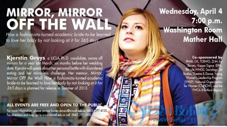 Kjerstin Gruys, a 29-year-old PhD student in sociology, has gone mirror-free for an entire year, avoiding her own reflection in order to boost her self-esteem and inspire others to stop focusing on their physical appearance.29岁的社会学女博士柯基丝汀-格鲁伊斯度过了一整年不照镜子的日子。避免在镜中看到自己的影像,这是为了增加她的自尊,也是为了激励别人不要过于关注外形。