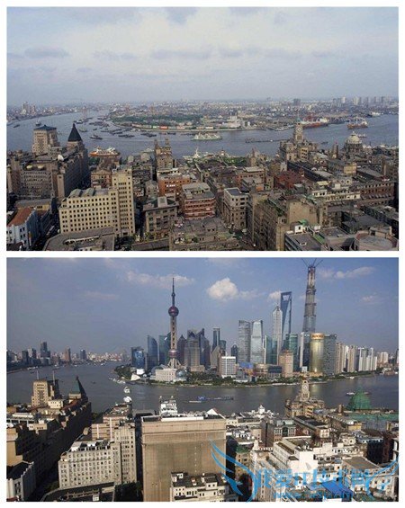 Shanghai's dramatic transformation into a skyscraper-packed megalopolis with a population of around 23 million has been captured in two photographs taken just 26 years apart.从这两张时隔26年的新老照片可以看出,上海在短时间内从普通城镇华丽变身为拥有2300万人口、高楼林立的大型都市的过程。
