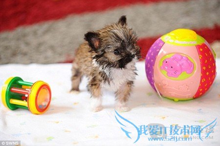 Mrs McLinden has built a special crate for the dog to sleep in, but cannot find a collar small enough for his little neck. Speaking of the other dogs in his litter of Chihuahua Lhasa Apso crosses, 'They are all so boisterous, but he is just too small to be boisterous, he’s just an energetic loving pup. He has one ball that he likes to chase, we found a practice golf ball that he can use, but even that is bigger than his head. We’ve just started trying to wean him onto dog food, and we have to rub around his little gums to help him eat. He seems do be doing well though and we hope he stays fit and healthy.'麦克林登夫人为这只小狗建造了一个特别的小家,但是找不到合适它的项圈。说起吉娃娃和拉萨阿普索犬的杂交犬,“它们都很欢实,但这只太小了折腾不起来。但是它仍然很有精力。它喜欢追一只小球玩,我们给它找了一个高尔夫球,但是球比它脑袋都大。我们试图让它断奶,吃点狗粮,我们得在它的牙龈旁边按揉来帮助他咽食。它看来情况不错,我们希望它能健康成长。”