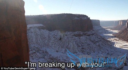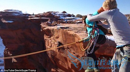 A thrill loving man pushed his cautious girlfriend off the edge of a cliff to take a ride on a 400ft pendulum swing in a narrow canyon in Utah.在犹他州的一处狭窄山谷里,一位爱冒险的男生把胆小的女友直接从悬崖上推下去,让她感受从400英尺高处跳下来荡秋千的感觉。