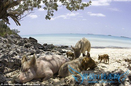 The pigs are so successful in their enterprise that they are now living the dream by raising their family of eight on a tropical island in the Caribbean with nothing to do but eat, sleep and swim.这些小猪的“事业”十分成功,在加勒比的这座热带海岛上,它们正繁衍着第八代子孙,不过它们也没什么事做,成天就是吃吃喝喝,睡个觉,游个泳。