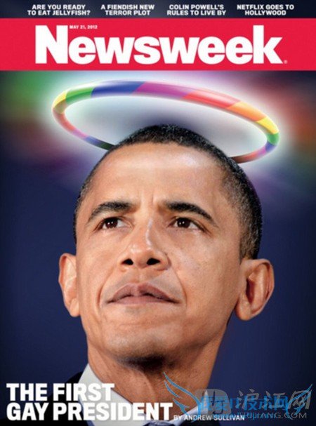 In a gutsy move, Newsweek has released the cover of their next issue, on the cover of which they depict President Obama with a rainbow halo and the title of 'The First Gay President'.具有勇敢大胆风格的新闻周刊已经发布了它下一期的封面,封面上是奥巴马总统头顶七彩光环,并被冠以“首位同性恋总统”。