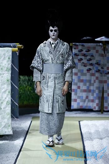 But that’s not to say it didn’t eventually click. In fact, upon further inspection, the outfits make a lot of sense, from the kimono-inspired cuts to the prints and patterns featuring Japanese motifs such as samurai, cranes and tea houses. The male models are even sporting white and red face paint like the geisha of old, and those awesome wooden platform sandals (actually called geta).但这并不是说这完全不顺应潮流。事实上,进一步审视,这身行头颇有深意,无论是由和服获取灵感作的剪裁还是日本武士、仙鹤、茶室等母题的印花和图案。男模特们甚至还刷白脸抹红唇扮成旧时的艺伎,穿令人惊艳的木质松糕凉鞋(其实就是木屐)。
