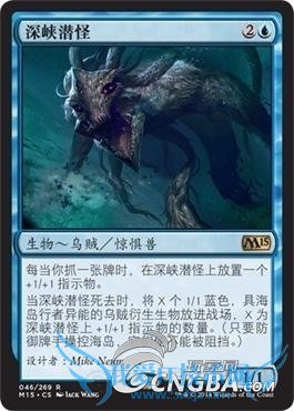 我打赌你没想到它的出现。这张牌起初看起来不算什么,可是越看它越出色。我不认为三回合出它是正确的。如果我们能闪现出它(比如克鲁芬斯的先知),然后抓一大堆牌。那不仅仅会让深峡潜怪变得很大,而且如果对手干掉它(当然不是用驱逐明光之类的放逐效应),我们就能有一大堆乌贼。它们都是海岛行者,遇上环境中最好的两套牌:白蓝控和大蓝,简直不能更好了。我知道潜怪通常活不下来,上述的场景也不总是能出现,但它还是一个大威胁。