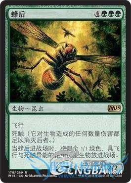 好吧,它需要7费。但是绿色的7费跟别的套牌中的四费五费差不多。另外,自从它出现以后,就一直是EDH的全明星生物,而且这个环境我们有和声召集。有很多信号表明,把绿色法术力投资在这个以一当五的飞行生物上是值得的,而且小昆虫们也能飞行死触。快攻套牌很难绕过它,能把它从坟场召回来就更棒了。和声召集套牌中至少出现一张蜂后,这也不会让我惊讶。