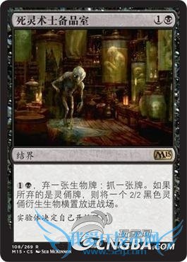 这是我没想到用在哪儿的一张牌。有很多人讨论它的用途,但并非所有人都关注它。它提供了一个让我们循环的方法,但如果有了合适的配合,它可以让我们造一大票灵佣。所弃的牌必须是生物牌,所以组牌时,有很多方法利用这个异能,比如说M15的各种魂和摩登的墓场匍尸。在T2,我可以想象用它弃掉暗贾,然后再用鞭子拉回来。