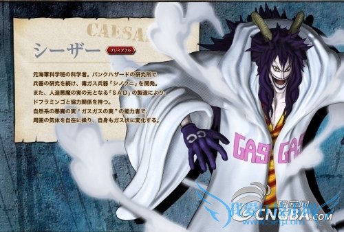 草帽海贼团在新世界登录的第一座岛庞克哈撒德,一般是烈火一半是寒冰的诡异岛屿。凯撒就是这座岛上的最终boss。一个恶心诡异没有人性的科学家。这座岛上除了两个大将战斗之后的场景之外,就只剩下这个可恶科学家的罪恶了。草帽一伙人揭穿了凯撒的伪善面具。瓦斯果实能力者,属于路飞最为讨厌的一类人。还是可怕武器史莱姆的制造者。动漫中目前是草帽海贼团的俘虏……