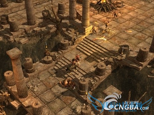 从蛇女的洞穴出来外面,刚刚好有个生命之泉,旁边还有一个商人可以卖掉不要的装备。原来这里就是之前被独眼巨人毁坏的桥的对岸(就因为过不了桥,竟然兜了这么大一圈)。继续前进,会遇到几个斯巴达的士兵,原来他们已经把巨人捉住了,不过没有人敢上前杀死巨人,这个光荣而艰巨的任务当然会留给玩家来完成啦。巨人的攻击非常单一,而且不会走出废墟的范围,所以很容易对付。