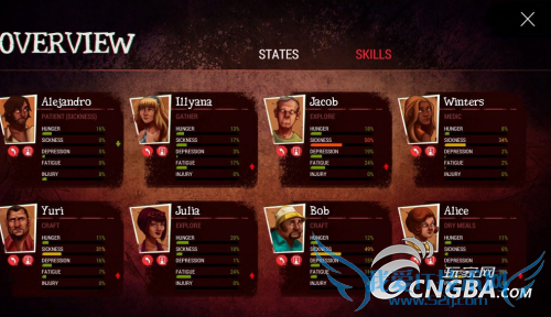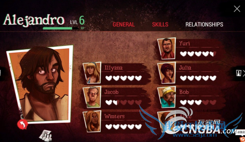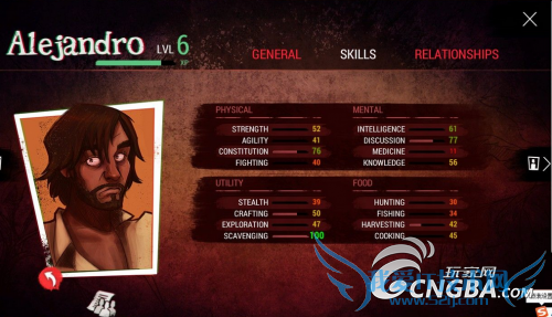 主角(ALEJANDRO):感觉比较平均,初期收集技能较高可用于收集,中后期万金油。推荐加点:SCAVENGING\EPLORATION\CONSTITUTION。