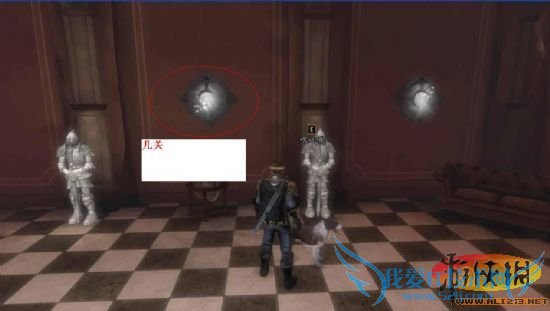第一次站到有两个盔甲一侧的,盔甲和棕红色沙发之间(脸贴着墙);第二次站到只有一个盔甲的那边,棕红色沙发旁边;第三次站到同一侧,地球仪的旁边,就成了。再走到气墙那,就可以跳过去了。(技巧,要是不行,简单的办法就是溜着上下的墙走一遍,有反应,在走一遍,再走一遍,一共三遍)