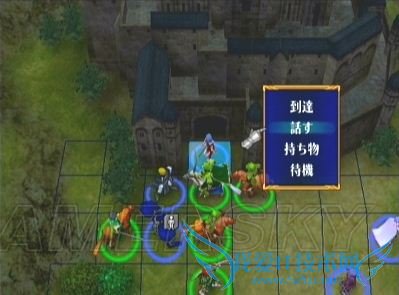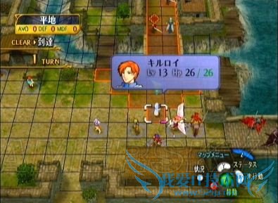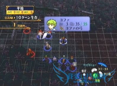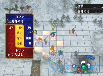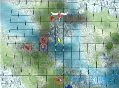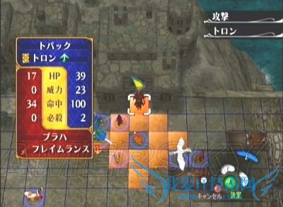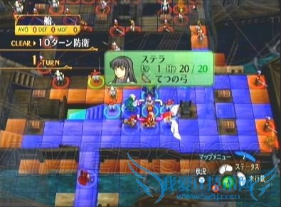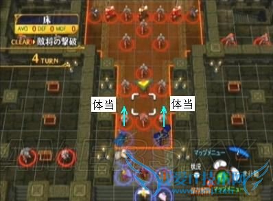 二、如果不打算第一回合说得ステラ,则必须将移动力是9的角色(一般情况下、这个任务完全可以交给圣骑大姐)配置在最上方,战斗开始后直冲向ステラ的下方格子,以防止她被右边包抄来的剑士虐死。如果想做得更完美的话,那就需要……转职后的飞马或飞龙一名^_^ 如下图所示配置在最右上方,到时候直接飞过去堵住左方的格子,ステラmm安全程度进一步提高