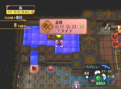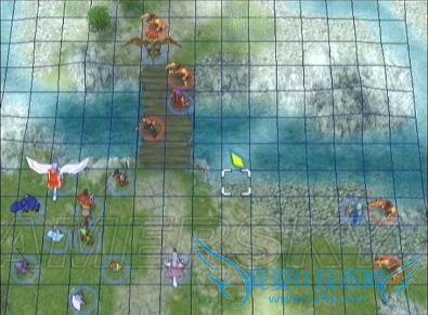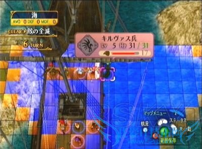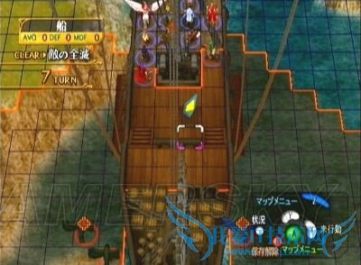 战场是在宽阔的水面上,但对我方绝大部分角色而言、可活动的范围只有小小的船甲板而已,所以面对移动超高的飞行系敌人,我方的站位就显得异常重要。尽量让强力角色刚好站在敌人射程内的边缘部分(下图为第一回合站位示例)引诱乌鸦上前攻击,再利用下一回合一举击破;同时也要保护好回复系,最好在回复系的相邻格子上全部排满我方角色,以求万无一失(如果是M难度的话,上一话盗贼偷到的远程回复杖用在这里真是再适合不过了^_^)