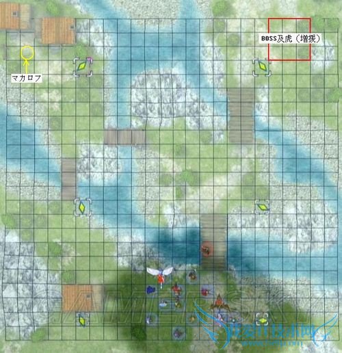 最右上方的兽人(虎)モゥディ则应该直接往右上方的桥上走,并如图所示使用ぶちかまし撞开前方的自警队。