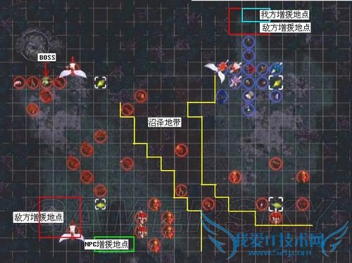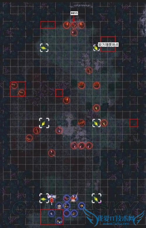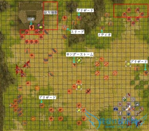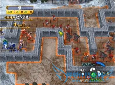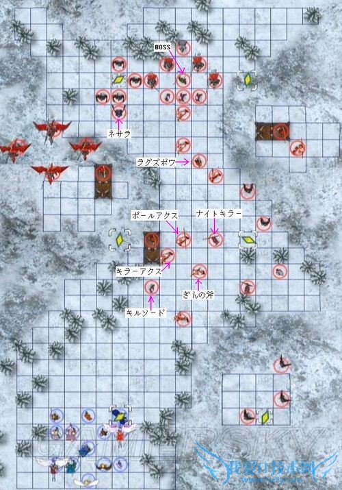 而BOSS附近的骑士团(除非我方进入其射程,否则不会移动)装备有钢大剑和短斧、实力也比较强,请大家清理完敌方援军后再慎重对付他们。此外、若玩家推进速度较慢的话,在第13回合和第16回合时又会遇到两大批的敌方增援(尤其是第一批装备有各类武器的圣骑,对付起来超级棘手),请随时保持严密的阵形、千万别被打个措手不及——不苛求奖励经验值的玩家完全可以一直留在地图中部(更浑确地说就是敌方增援的射程边缘,可参考下图的我方位置),等敌方援军出尽+消灭光之后再找BOSS麻烦好了