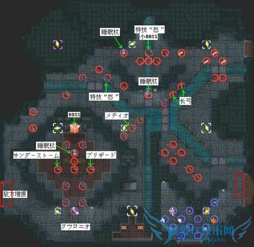 打前锋的敌杂兵对已身经百战的我军来说应该不在话下了,唯一有点麻烦的是中部房间装备超远程雷的贤者,在我方打开第一道门之前基本上拿他没有办法(当然、可以用之前得到的沉默杖or睡眠杖or超远程魔法对轰,不过个人总觉得有点浪费……),所以请及时给魔防低的伤员回复体力