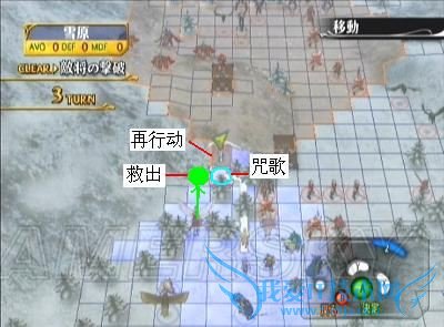 不管怎么说、在我方第二回合结束前,右下方的敌人必须全部清光,然后请将右下方的我方角色分成两批,分别往左方和正上方逃离。这是因为第4回合时,敌方角色ジル会率领龙骑军团从右下方增援,只要我方没有人物在她的攻击范围内,她就不会主动移动,如果本话她平安生存,下一话她就会加入我方。所以尽快消灭右下角敌人,然后迅速撤离,这才是最佳的战法