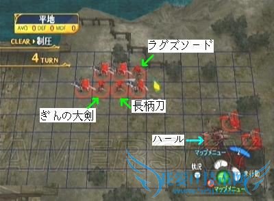 第二战场(主角对决黑骑士)我方第三回合开始时:ハルバーディア*2(地图左上阶梯处)