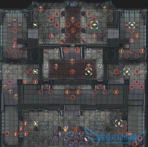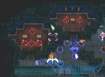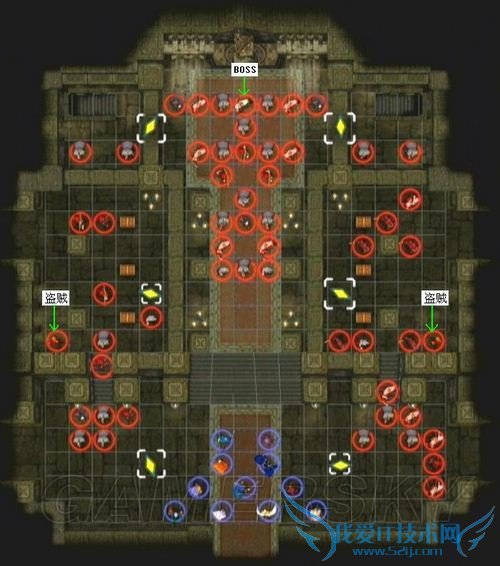 上方房间(左上、正上、右上)的门只要任意开启一扇,三个房间就会同时打开视野,里面的敌方高级职业可是一片一片的,装备也很精良。最好将我方集中在某个门口后,下一回合再让较弱的角色用钥匙开门,以便让其他人员迅速冲进去尽可能多地消灭敌人;另外也可以考虑用强力肉盾堵住门、让敌人无法一拥而上,之后再让后方人员分批消灭的战术。特别需要注意的是、那些装备沉默or睡眠杖的司祭相当讨厌,要是以前我方入手的沉默&睡眠杖有剩的话,个人推荐让魔力高的法师(魔力高的话杖命中率才会高)先发制人,然后让盗贼上去偷走敌司祭的杖,这样既保证了我方的安全,又能赚到新的状态杖。只是盗贼的能力可别太低了,不然会被敌人击毙的说