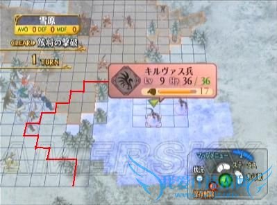 第四回合结束后,就算我方不进入BOSS那超宽的射程(此外、如果我方已经跨过两端山道的第一个拐角,BOSS也会提前出击),他也会自行移动。凭借9点的移动力、1-2自适应的射程、再移动的职业特性,他很轻易的就能偷袭到我方相对较弱的成员;更讨厌的是特技“勇将”(效果:HP减至50%以下后、力技速增加50%),发动后他的实力会提升不少