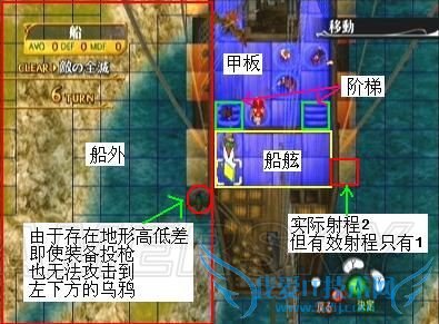 注意:船内与船外、船上阶梯与甲板之间存在高低差,所以哪怕敌人的位置贴着船沿,我方也只能用远程攻击打到他们;同样、如果敌人站在船上阶梯或者船舷上,站在甲板上的我方也只能使用远程攻击。所以一定要算准攻击范围、慎重行事——下图是地形差的示意图,小绿虽然装备着投枪,但也只能攻击到船外的1格范围而已
