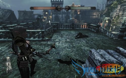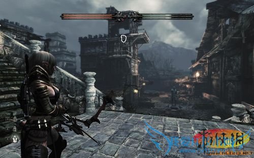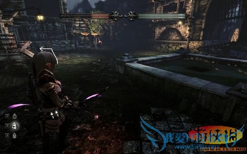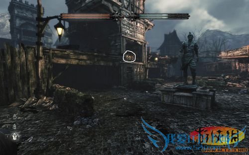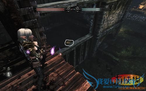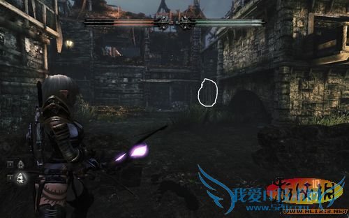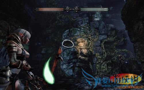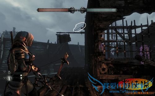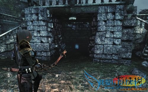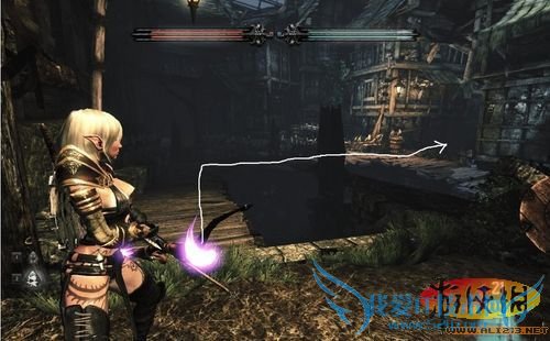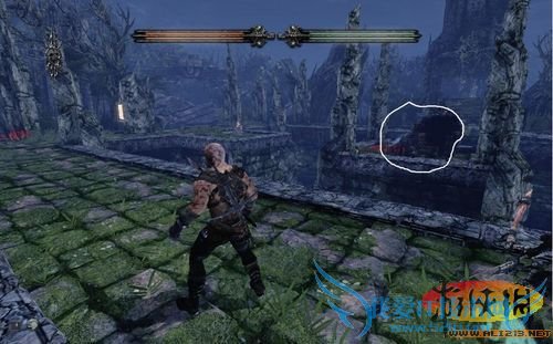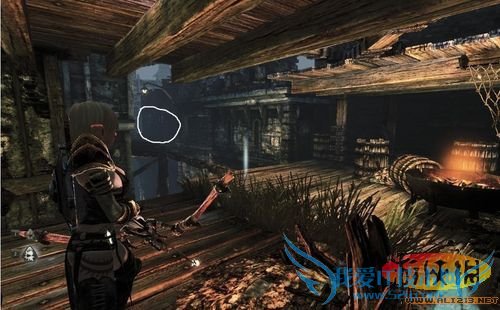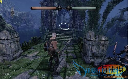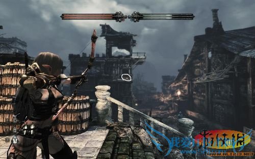 就在出很多怪的那里 打完之后上楼梯 它会有提示 叫你射死高塔上面的怪物 就是那座塔 图上画圈的地方是一条绳子 射断它就会砸出一个门