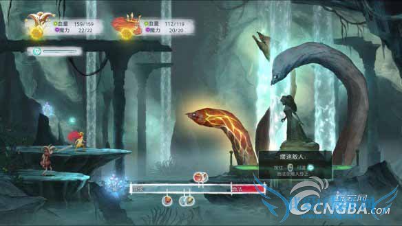 向前不远进入BOSS战,此处BOSS建议带上魔法师,怪物的三个头分别针对三个属性,而魔法师可以很轻松的用对应属性进行攻击。笔者的战术是:先用附魔了水系大宝石的小丑配合水大宝石的主角,把火属性的头给干掉,然后小丑换法师,法师对应属性攻击,主角光束辅助输出。之所以不一开始就上法师是因为敌人会各种打断,而法师蓄力时间长还不会防御。BOSS的输出不高,关键是看好战斗节奏不要总是被打断。笔者是16级通过的,感觉非常轻松,也没有喝药。