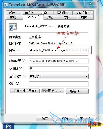 1、刚才建房者查出来的IP现在就有用了,把TeknoGods_MW2SP.exe建立一个快捷方式,然后右键点击,选择属性,在“目标”那一项的内容最后面添加上“ --ip=XXX.XXX.XXX.XXX”,那些XXX就是建房者查出来的的IP。注意两个减号前面是一个空格,输入完成后,整行是:
