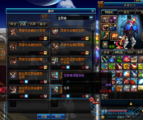 二、所有传说武器、防具、首饰、左右槽都在公共频道NPC鲁特船长那里。其中武器建议做格拉西亚家族武器系列,原因很简单,自带光属性攻击、光强等,非常适合PK和走光强的刷图党,材料需要80个伪装者的调查报告,如果刷魂图,26天即可做出来。