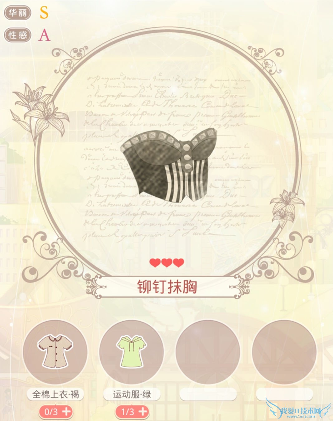 接下来就是上衣了,铆钉抹胸,同样的他的制作也是需要两个部件,这两个部件在少女1-8 ,少女1-9 中获得,只需要用体力去扫荡就可以啦。