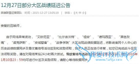 由于网络异常波动,“艾欧尼亚”、“比尔吉沃特”、“祖安”、“德玛西亚”、“黑色玫瑰”、“诺克萨斯”、“皮城警备”、“战争学院”大区出现战绩数据延迟,将影响官网个人中心的历史战绩数据同步及雪仗集结号活动签到和奖励领取,技术人员正在进行修复,如您已完成战斗但无法领取奖励,请在对局结束后24小时再次尝试。雪仗集结号活动在2015年12月25日10:00~2016年1月10日23:59均可进行补签及奖励领取,请耐心等待数据同步。