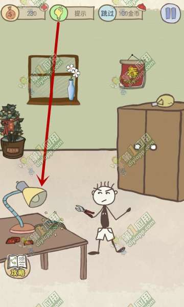 这关小编研究了很久,最后我只想说“坑无处不在!”。如下图所示,将提示按钮上面的灯泡拖动到左下方台灯上就行了(要等坑爹男说完话后才可以拖动)。
