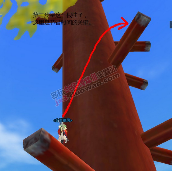 如果能在这里成功降落,那么恭喜你,节省了一个扶摇的时间(30秒噢~)。如果这里跳不上去,那就只能先扶摇跳到那个比较低的柱子上,然后等扶摇CD再去跳另一个,白白浪费30秒钟。