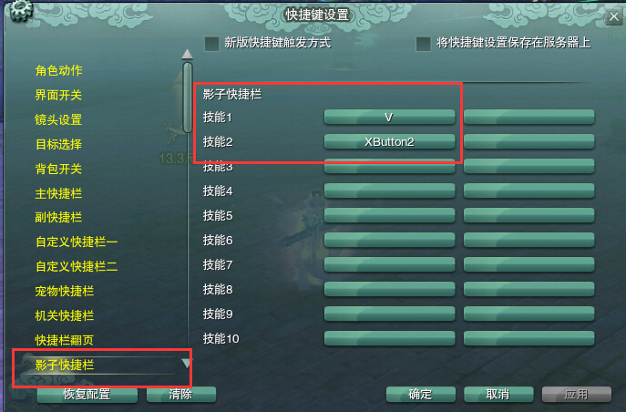 通过设置快捷键,我们可以非常方便、快速的对影子进行操作,我对图中技能1、技能2的设置,分别对应了“远、近”这两个位置