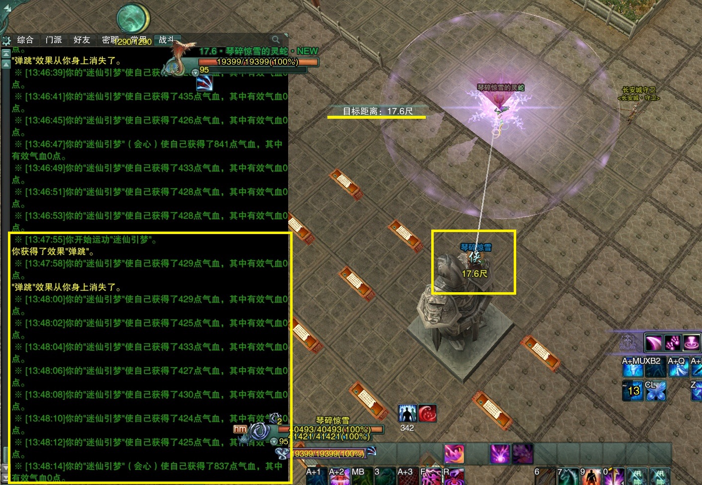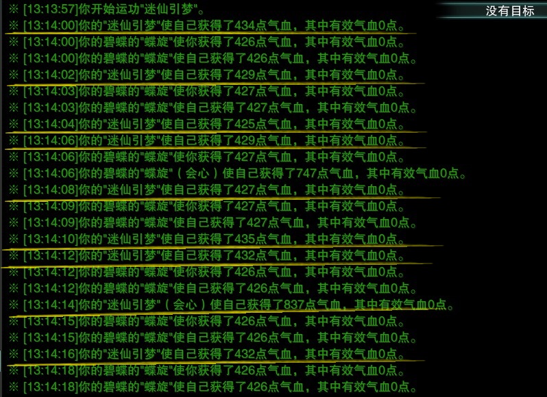 如图,迷仙引梦的加血能力和碧蝶(3秒一跳)差不多,技能系数是0.083左右,有12-24点的浮动,值得庆幸的是,和碧蝶不同,迷仙引梦跟随玩家的双会(碧蝶自身有双会,会效175%固定值)。补充说明图上碧蝶是加它自己和宿主,所以看着一次跳两个治疗。