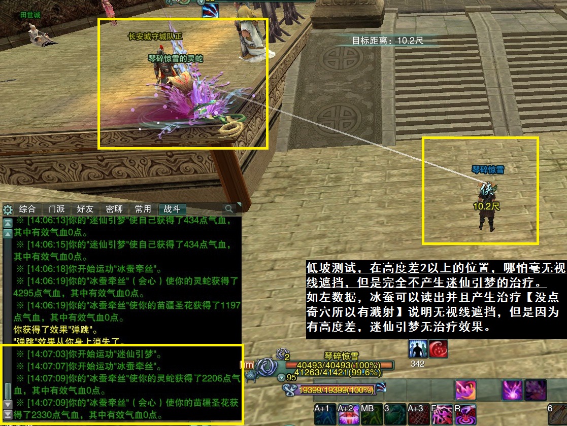 也就是他更倾向于抬平面以上的,也就是说大漠会坑…奇坑无比………这个很很多区域治疗都不太一样,我测了同个位置醉舞可以达到的自上向下,这个技能不可以。但是这个技能可以自下向上治疗……