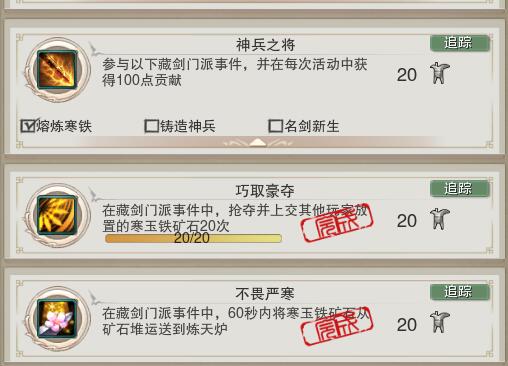 【熔炼寒铁】事件周一至周五全天开启,侠士可帮助藏剑弟子搬运寒玉铁协助熔炼,为打造新一代名剑做准备。