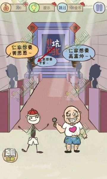 坑爹男居然要相亲!看见左上方那位美女了吗?嗯我们暂且算她是个美女好了。将大屏幕上的“坑”字拖动到“干”字上面,干爹变坑爹~,然后再点击她一下,就会立马走到坑爹男身边,从此他们过上幸福美好的日子,我们祝福吧!