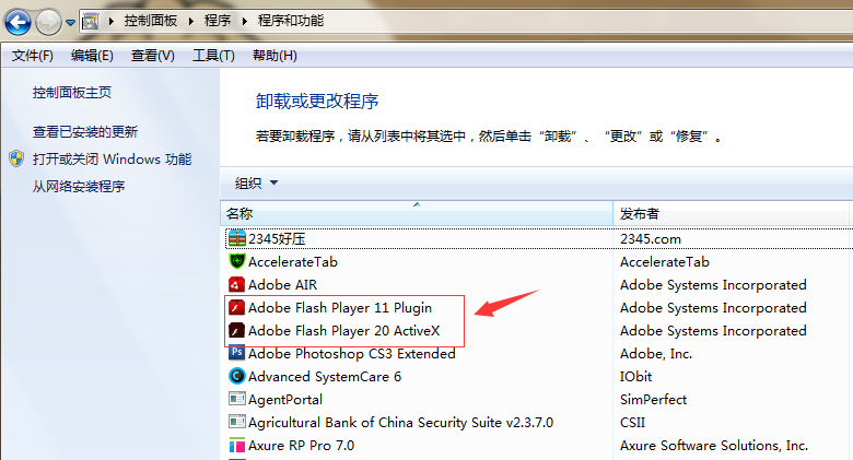 将其卸载(adobe flash player 11 plugin和adobe flash player 20 activer都要进行删除)