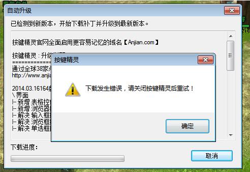 设置后,运行按键精灵程序会提示“下载发生错误...”,点击确定,按键精灵会弹出来,可正常使用。
