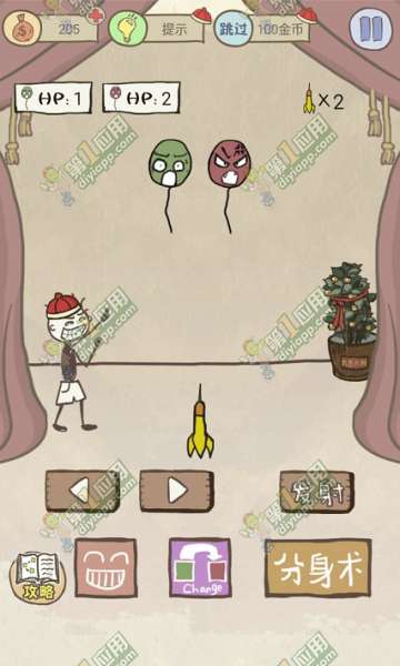 答:最坑爹7的第十八关,坑爹射气球 在史上最坑爹的游戏7坑爹射气球这关中,我们需要帮助坑爹男射气球。我们发现只有一个飞镖但是有两个气球,那么我们应该怎么设计呢?玩家可以点击发射这个按钮,然后在迅快的点击分身术按钮。然后就可以发现一个飞... >>详细