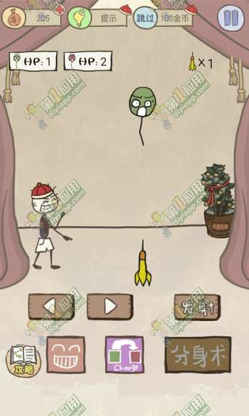 第一个飞镖,发射后点分身(要在击中气球前点击哦),然后用第二个飞镖射击剩下的那个气球就可以啦啦!