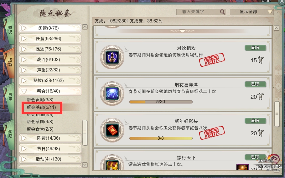 首先我们回到帮会领地,我们先一起来看一下在帮会才可以完成的几个成就,在帮会的帮会基础界面可以看到几个成就:
